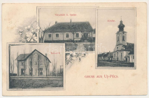 Újpécs, Új-Pécs, Peciu Nou (Temes, Timis) vasútállomás, A. Seeler üzlete, templom. Forrás: https://