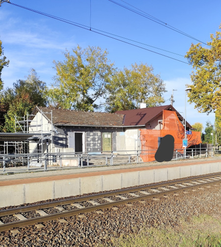 A megálló épülete szemből a vágány túloldaláról nézve.