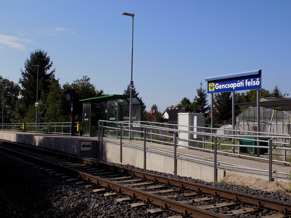 A megállóhelynél lévő sorompó nélküli vasúti átjáró Gencsapáti centruma felől nézve.