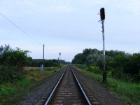 A megállóhely és a A Hansági-főcsatorna hídja között,a 689-690-es szelvényben lévő önműködő térközjelző a híd felől nézve.