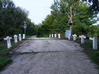 Közvetlenül a Hansági-főcsatorna hídja mellett lévő fénysorompóval biztosított vasúti átjáró,a 86-os számú főközlekedési út felől nézve.
