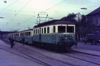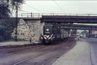 Közvágóhíd, HÉV-végállomás. A ráckevei vonat szerelvénye elé éppen beállt a vontató dízelmozdony. Mivel a Tököl és Ráckeve közötti pályaszakaszt csak 1975-ben villamosították, a ráckevei HÉV-et addig dízelek továbbították, míg a vonal többi szerelvénye a "szokásos" villamos motorkocsis üzemû volt. A bal oldalon, az Ik180-as csuklós busz mögött a volt 22-es villamos vágányának bontása látható.