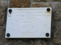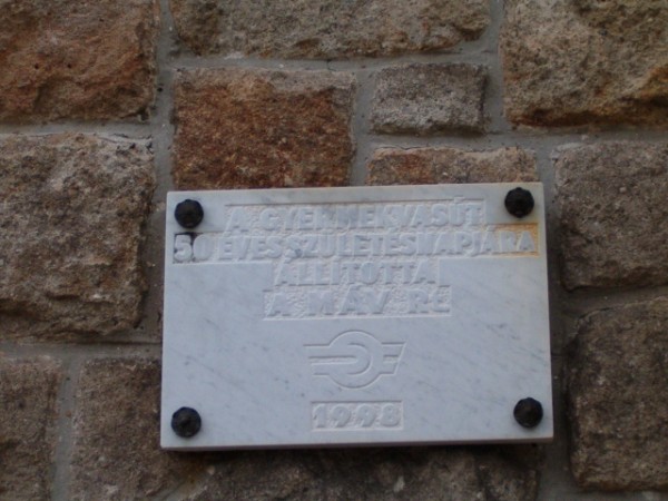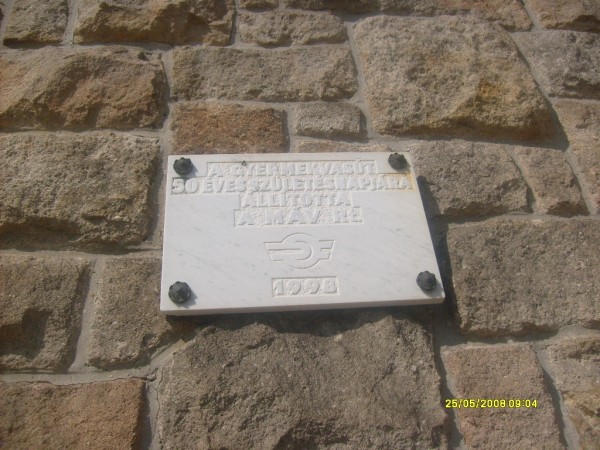 A Gyermekvasút 50.éves Születésnapjára állított,1998-ban leleplezett emléktábla,a felvételi épület utcafront felőli oldalán.