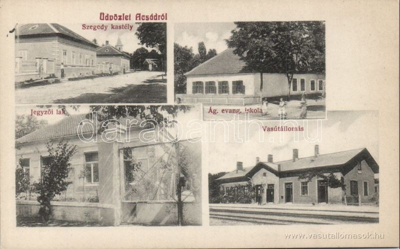 Acsád állomás felvételi épülete látható fénykorában még a Déli Vasút állomásaként a képeslapon