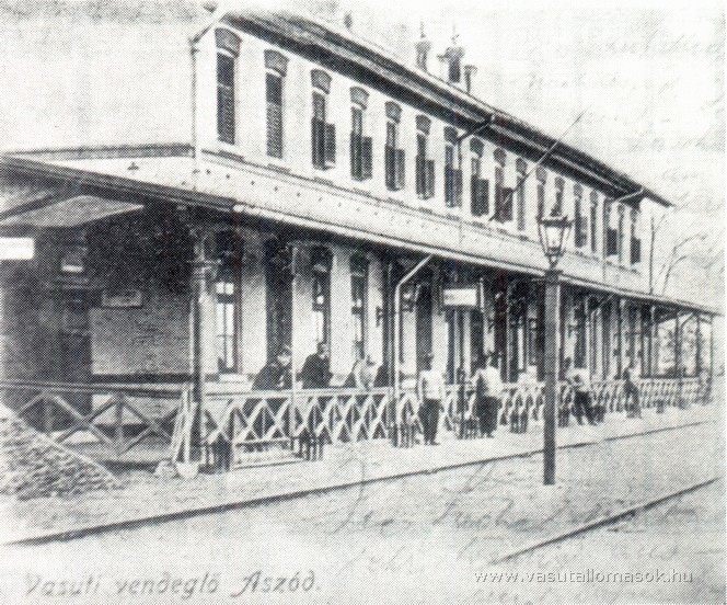 A képen a régi, a Magyar Északi Vasút tervei szerint épült aszódi állomásépület kibővítve és verandával kiegészítve látszik. A felvétel 1900 körüli. (Forrás: Vasúthistória évkönyv 1993.)