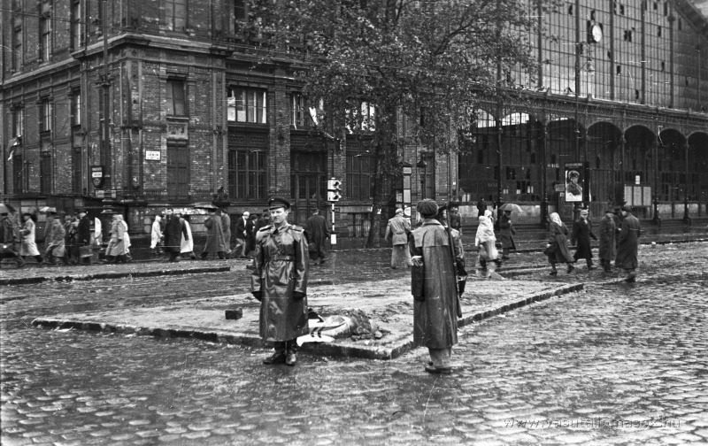 A pályaudvar homlokzata az 1956-os forradalom idején. Forrás: Fortepan / Nagy Gyula (40229)