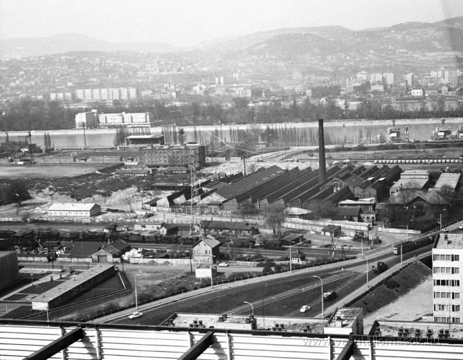Vizafogó pályaudvar magasból nézve lakóőrházzal, selejtezésre váró gőzösökkel, UV villamossal.