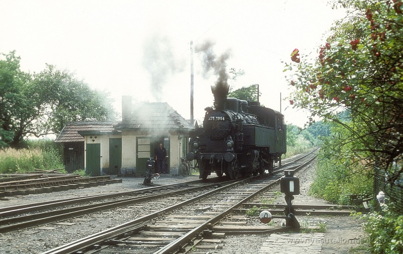A 375.1014 számú gőzös körüljár Diósjenő állomáson, a Vác felőli váltókörzetben