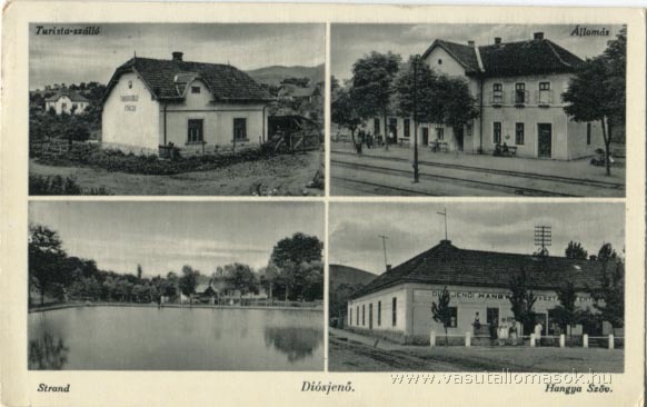 Diósjenő állomás már kibővített felvételi épülete látható a képeslap jobb felső képén.Forrás:korabeli képeslap