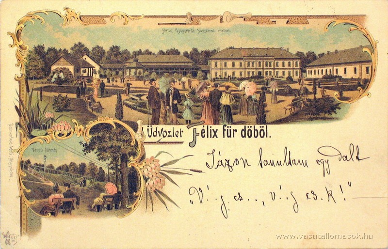 Félixfürdő vasútállomás látható az üdvözlőlap bal alsó képén.Forrás:korabeli üdvözlőlap