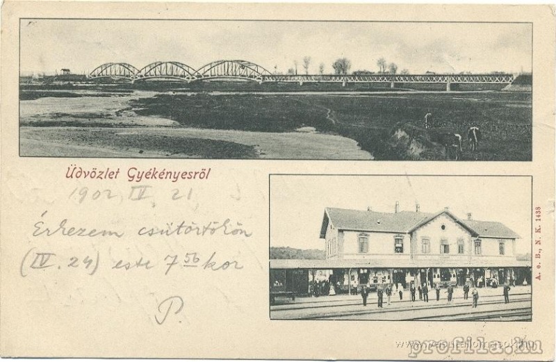 Gyékényes állomás régi felvételi épülete látható a képeslap alsó képén. Forrás: profila.hu korabeli képeslap.