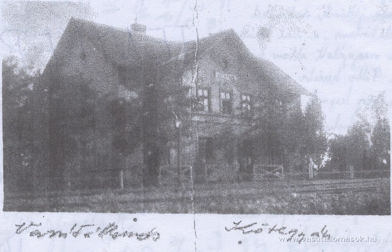 Kötegyán állomás régi képeslapon. Sajnos a felvétel elég rossz minőségű, de jól kivehető rajta a HÉV I. osztályú felvételi épület. (forrás: Kubinszky Mihály gyűjteménye)
