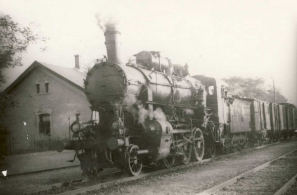 Egy századfordulós kép az állomásról előtérben egy gőzmozdonnyal. A kép alapján az eredeti épület a beledire hasonlít. Forrás: