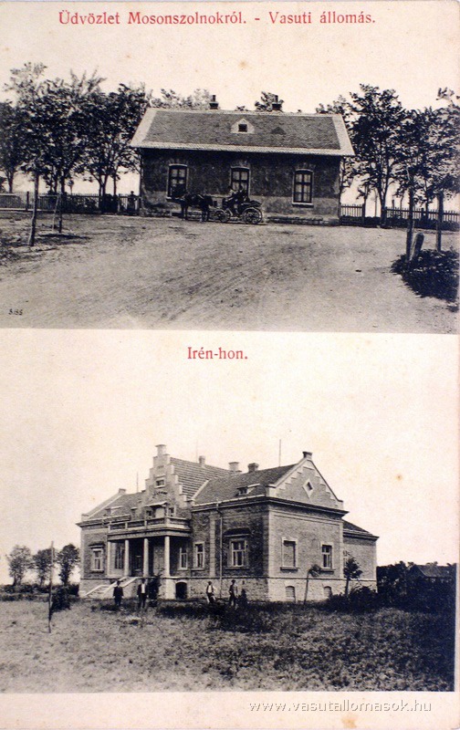 Mosonszolnok állomás eredeti felvételi épülete látható a képeslap felső képén.Forrás:korabeli képeslap