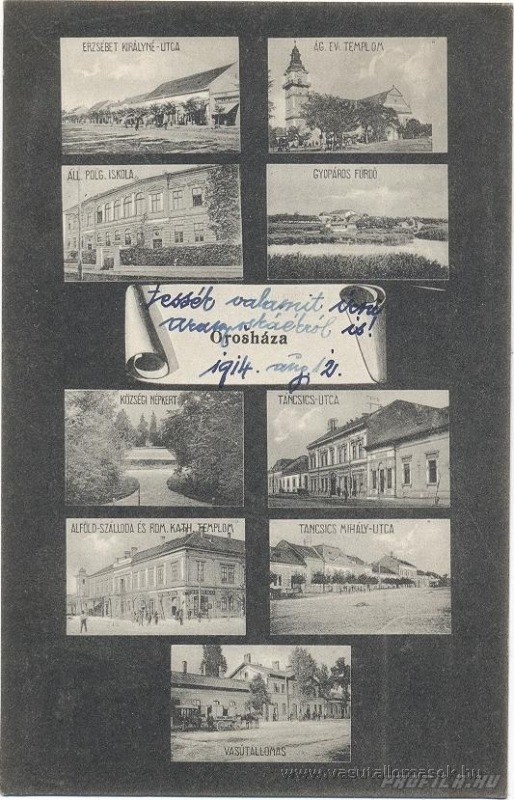 Orosháza állomás felvételi épülete látható a képeslap alsó képén. Forrás: profila.hu korabeli képeslap.
