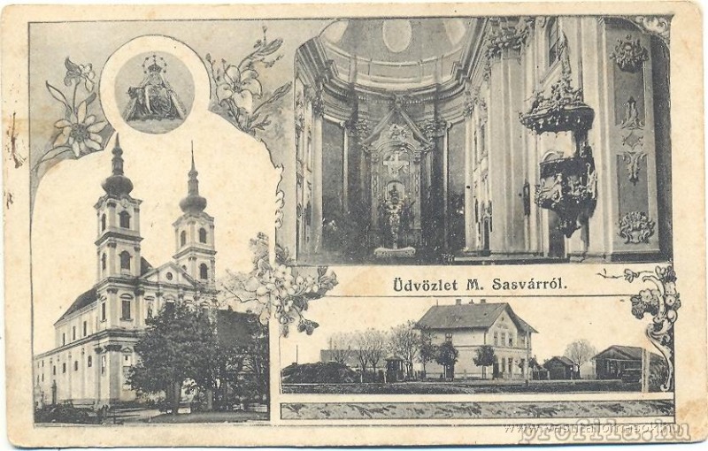 Sasvár állomás látható a képeslap jobb alsó képén.Forrás: