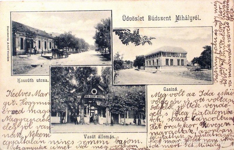 Büdszentmihály állomás felvételi épülete látható a képeslap alsó képén.Forrás:korabeli képeslap