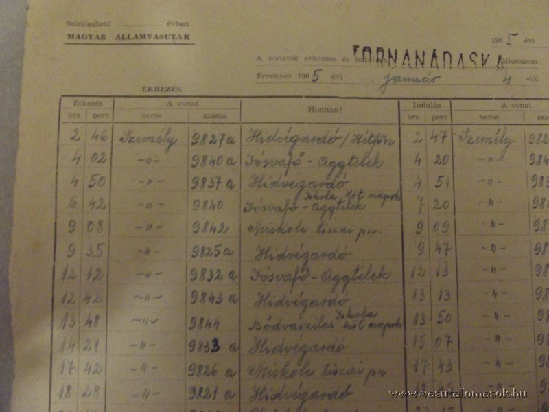 Menetrendjegyzék 1965-ből. A Vonatok akkor még Hidvégardóig jártak.