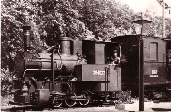 A 394-023 psz. gőzös és a D 60 poggyászkocsi Nádtelep MH.-nál. Forrás: korabeli képeslap.