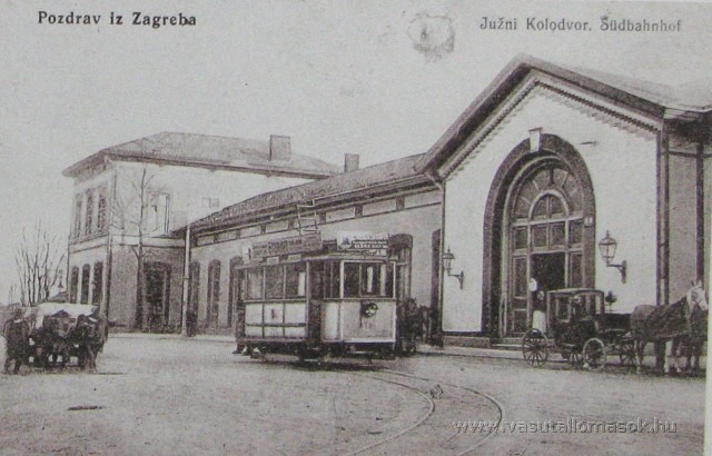 Zágráb.Déli Vasúti pályaudvar,a városi villamos vasúttal.Forrás:korabeli képeslap