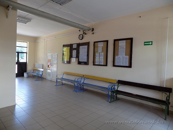 A vonatra itt is várhatunk. A falon az aktuális menetrendek, hirdetmények. Balra az ajtón kilépve szintén a vágányokhoz jutunk.
