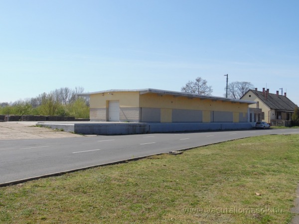Jó állapotú(működő?) árúraktár, mögötte egy vasutas lakás.
