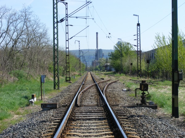 A másik - Környe felé eső - nyílt vonali elágazás. A kép közepén a bánhidai erőmű kéménye magasodik.