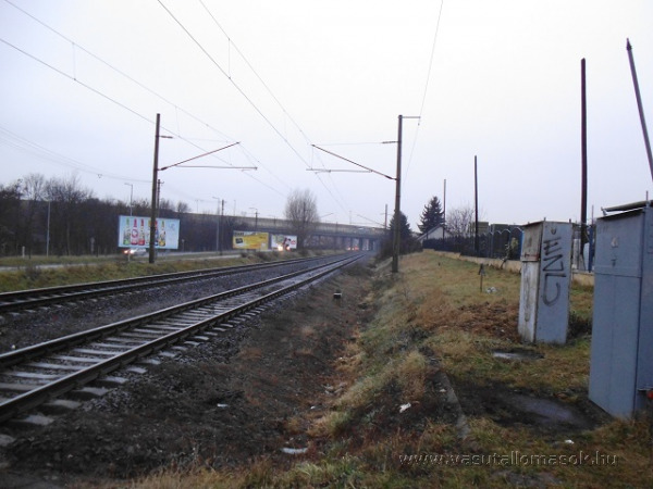 A régi megálló helye a Nagytétényi útnál. A felsővezeték-tartó oszlopok az egykori peron miatt vannak beljebb a vágányoktól.
