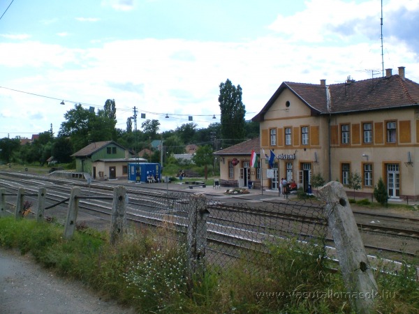 Az állomás épületei a szemközti rézsűről fotózva.