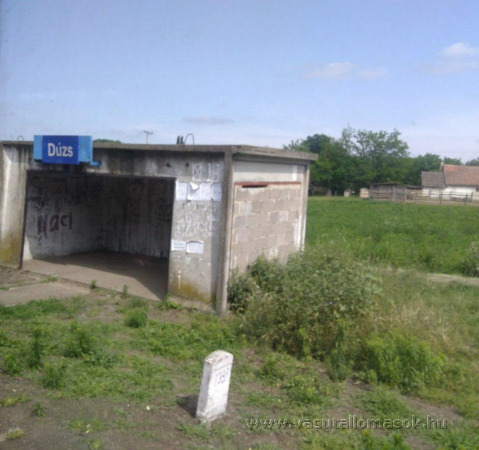 Vandalizált betonszarkofág a dúzsi megállóhelyen. A kép a 8036-os személyvonatról készült.