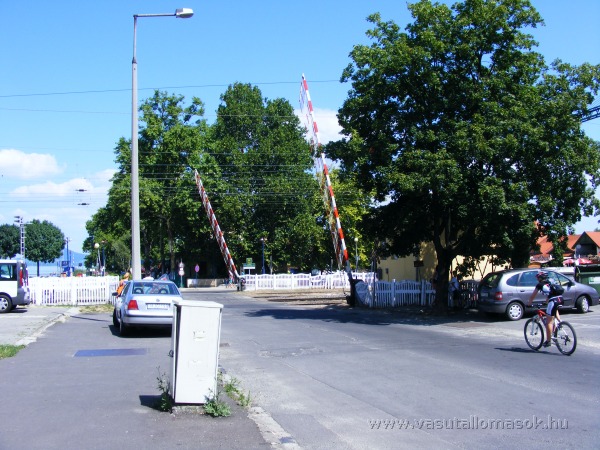 Az állomás balatonfenyvesi oldalán lévő teljes csapórudas sorompóval biztosított vasúti átjáró Fonyód centruma felől nézve.