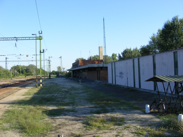 Pillantás az oldalrakodó széléről a felvételi épületre. Jobbra a biztosítóberendezési épület és a kerékpártároló.