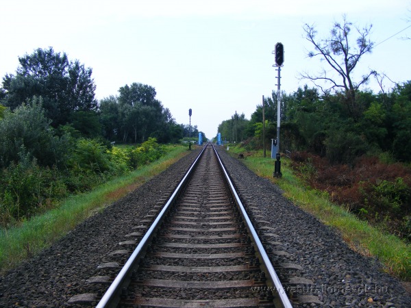 A megállóhely és a A Hansági-főcsatorna hídja között,a 689-690-es szelvényben lévő önműködő térközjelző a megállóhely felől nézve.