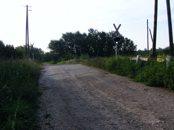 A megállóhelynél lévő fénysorompóval biztosított vasúti átjáró Hanságliget centruma felé nézve.
