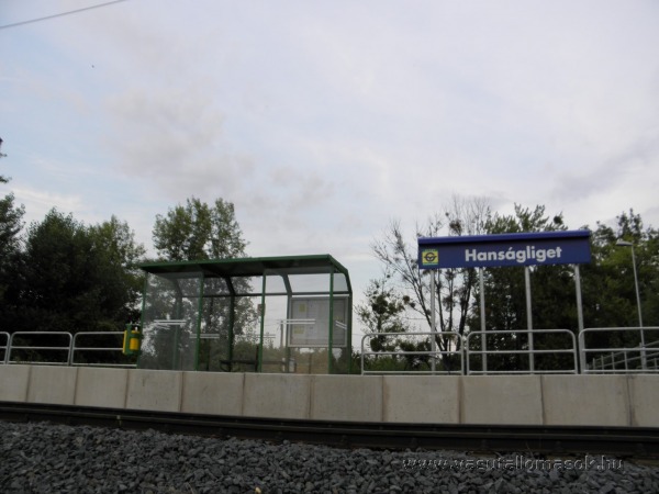 A peron, az új esőbeálló, és a megállóhely névtáblája a vágány túloldaláról
