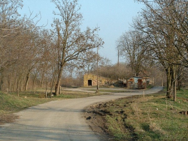 Az egykori állomás déli vége felé nézve még állnak az egykori élőállat-rakodó romjai, a túloldalán a karámok még jó állapotban vannak.