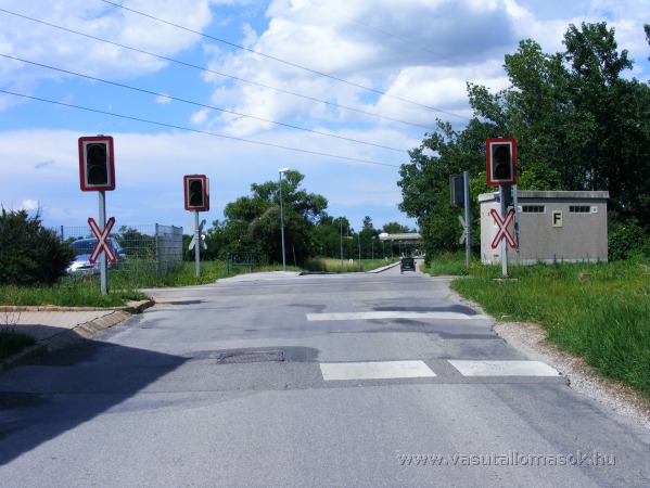 A megállóhelynél lévő vasúti átjáró Katzelsdorf centruma felől nézve.