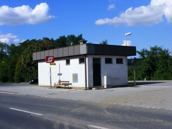 A megállóhely épületének utcafront felőli képe Lépesfalva-Somfalva felől nézve.