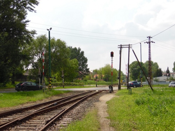 Az állomás kijárati jelzője és a Nyírbátori út átjárója.