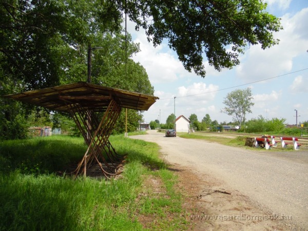 Az állomás biciklitárolója, mögötte padok a vonatra várók számára.