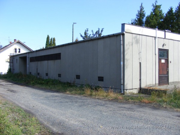 A biztosítóberendezési épület utcafrontja, mögötte a felvételi épület.