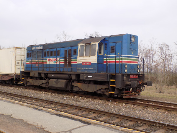 740-es sorozatú dízelmozdony a ZOSLOKO színeiben konténervonatával várakozik az állomáson.