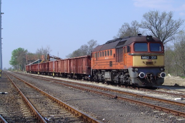 A kirakodás után az M62 231 psz-ú "szovjet" őserő visszahúzza szerelvényét Szeged-Rendezőre. Az M5-ös autópálya építéséhez hozott anyagot.