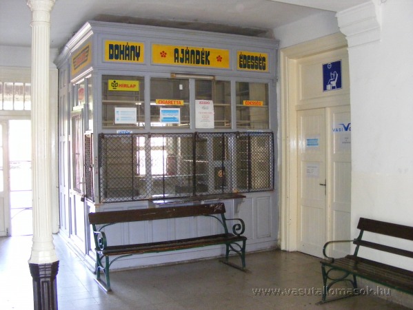 Trafik, most üresen. Jobbra a Vasi Volán irodája, balra kijárat a vágányokhoz.