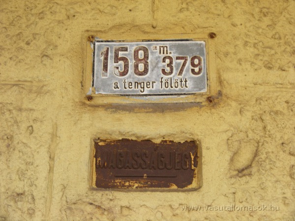 Magasságjegy a felvételi épület vágányok felőli oldalán.