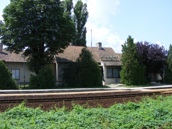 A felvételi épület a vágányok felől nézve.