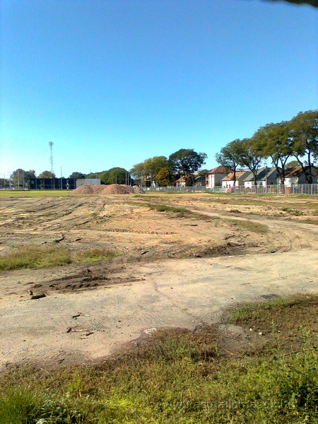Pillantás a járdáról az egykori fatelep irányába. Itt előttünk állt a kisvasút állomásépülete, amelyet elbontottak. A háttérben az új bevásárlóközpont, mögötte van a fűtőház.