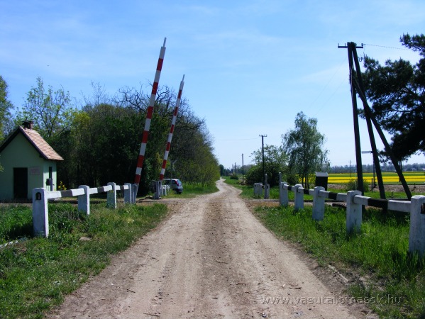 A megállóhelynél lévő csapórudas sorompóval biztosított útátjáró Kópháza felől nézve.