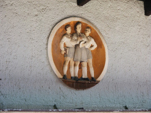 A felvételi épület homlokzatán lévő dombormű.