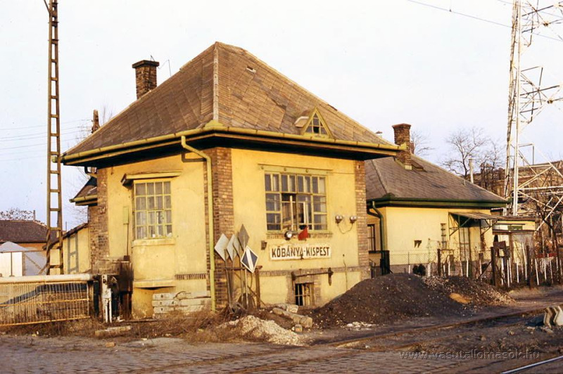 Kőbánya-Kispest vasútállomás, mellette a sorompó a Vasgyár utca végén a szintbeli keresztezésnél, 1976
